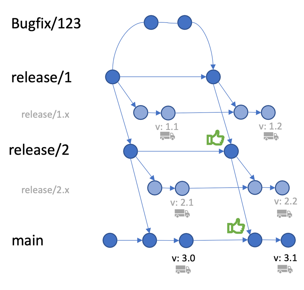 Changes can now be propagated downstream from a ‘bugfix’ branch to ‘release/1’, further on to ‘release/2’, and all the way down to ‘main’. As version changes are not propagated, no version-based merge conflicts will appear.