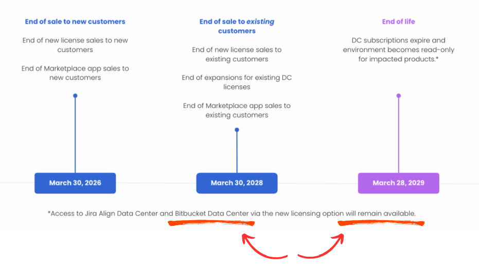 Atlassian has now set a formal end-of-life timeline for impacted Data Center products, including a wind-down starting March 30, 2026, and an end-of-life date of March 28, 2029 (when impacted Data Center products and their Marketplace apps become read-only).