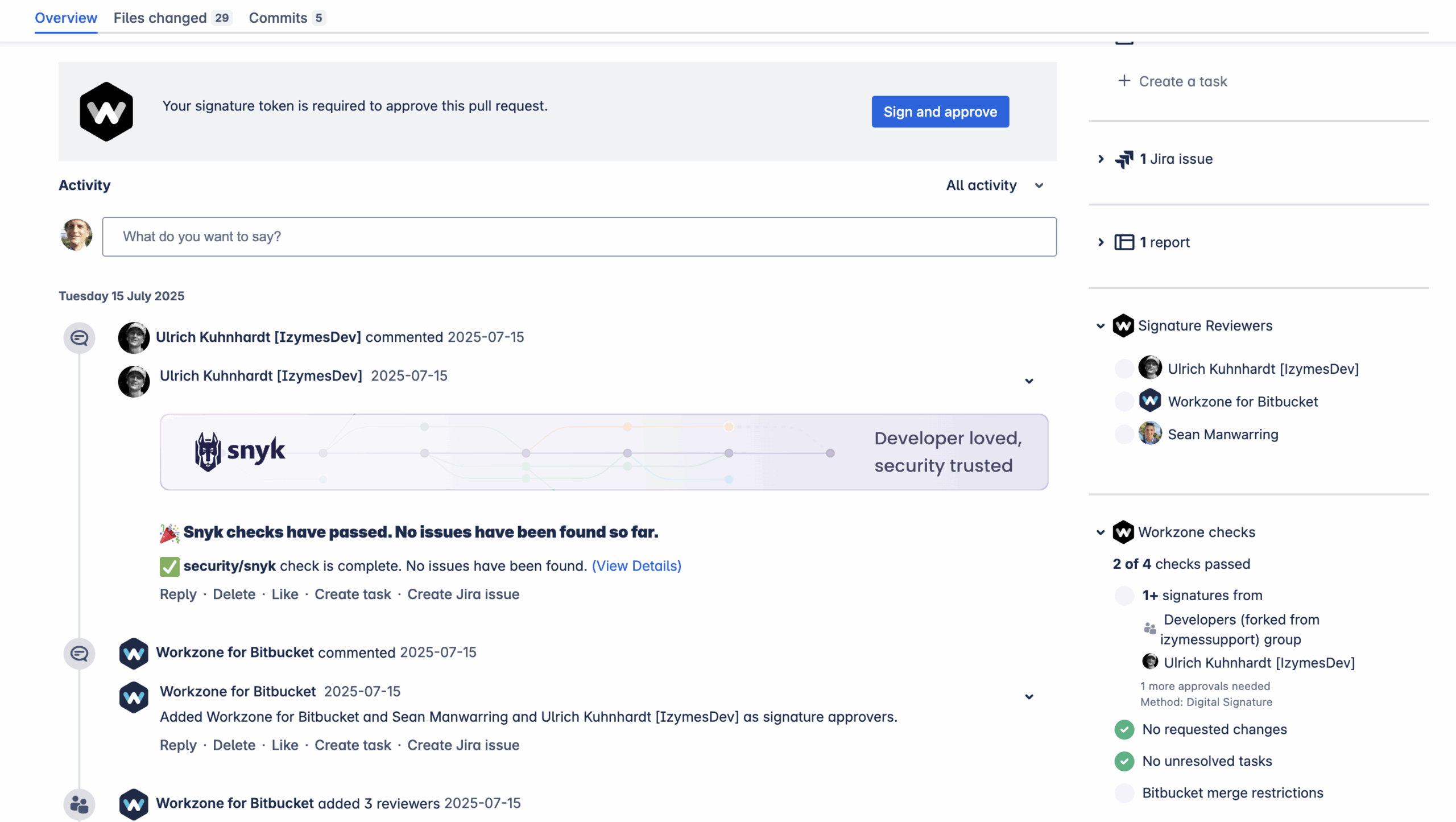 This overview allows managers, auditors, and compliance officers to gain real-time insights into the quality and compliance posture of code changes, making it easy to identify blockers and track whether all organizational policies have been met before merges