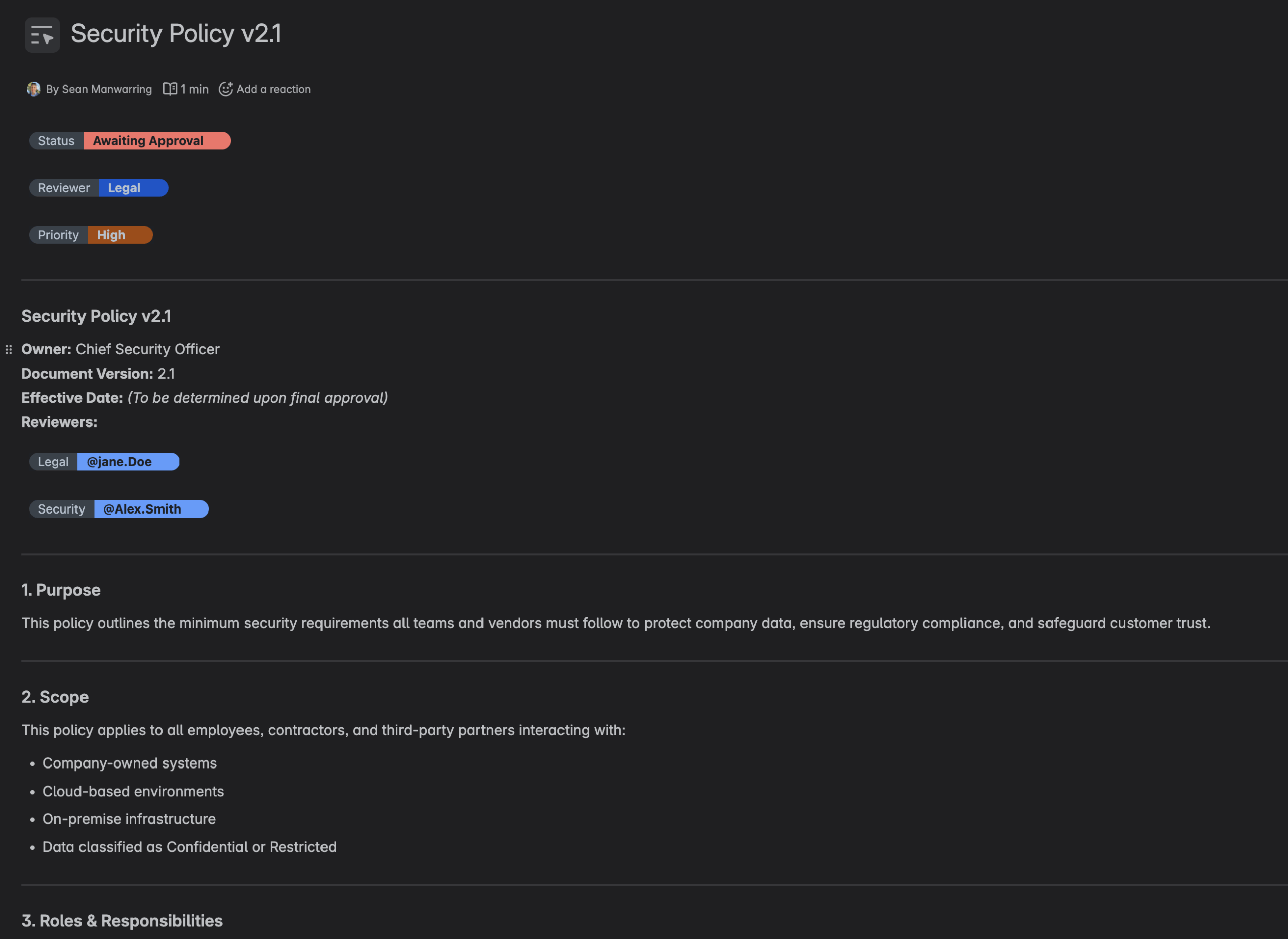 For legal, risk, security, or compliance teams working in Confluence, approving internal documentation, policies, or release notes often requires a structured sign-off process. But Confluence doesn’t provide any built-in way to track the status of approvals, who approved what, or what still needs review. This leads to Slack messages, endless comment threads, and risky assumptions that something is “probably approved.”
