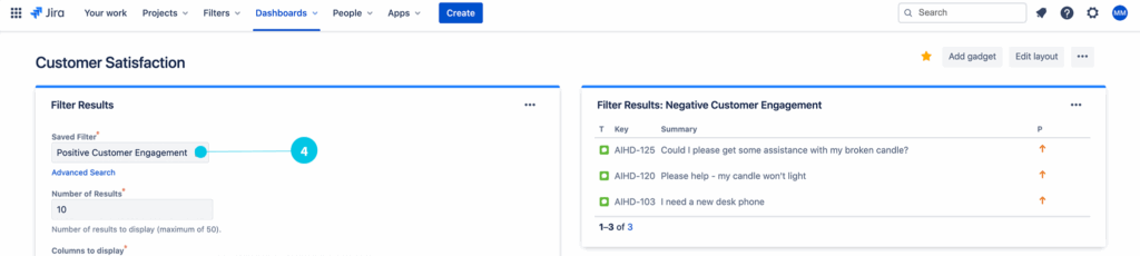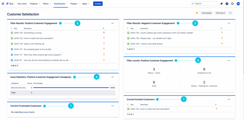 AI Insights empowers organizations to build tailored customer satisfaction dashboards within Jira using existing dashboard and gadget frameworks. By leveraging AI Insights’ customer sentiment data, teams can add gadgets such as Filter Results, Filter Counts, and Issue Statistics to visualize key CSAT metrics. These dashboards aggregate sentiment scores from saved filters, allowing managers and agents to monitor satisfied, frustrated, or neutral customer interactions across projects in real-time. With configurable columns and multiple gadgets, the dashboard provides a holistic view—helping teams quickly identify patterns, prioritize interventions, and track the effectiveness of support strategies.