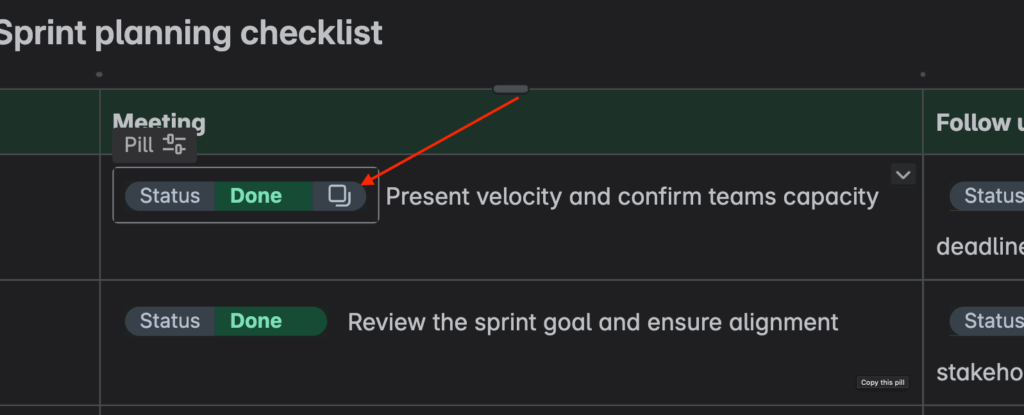 To copy Status Labels for efficiency in updating your page, click the copy icon within the ‘pill’. You can then paste the copied status label one or more times as required.