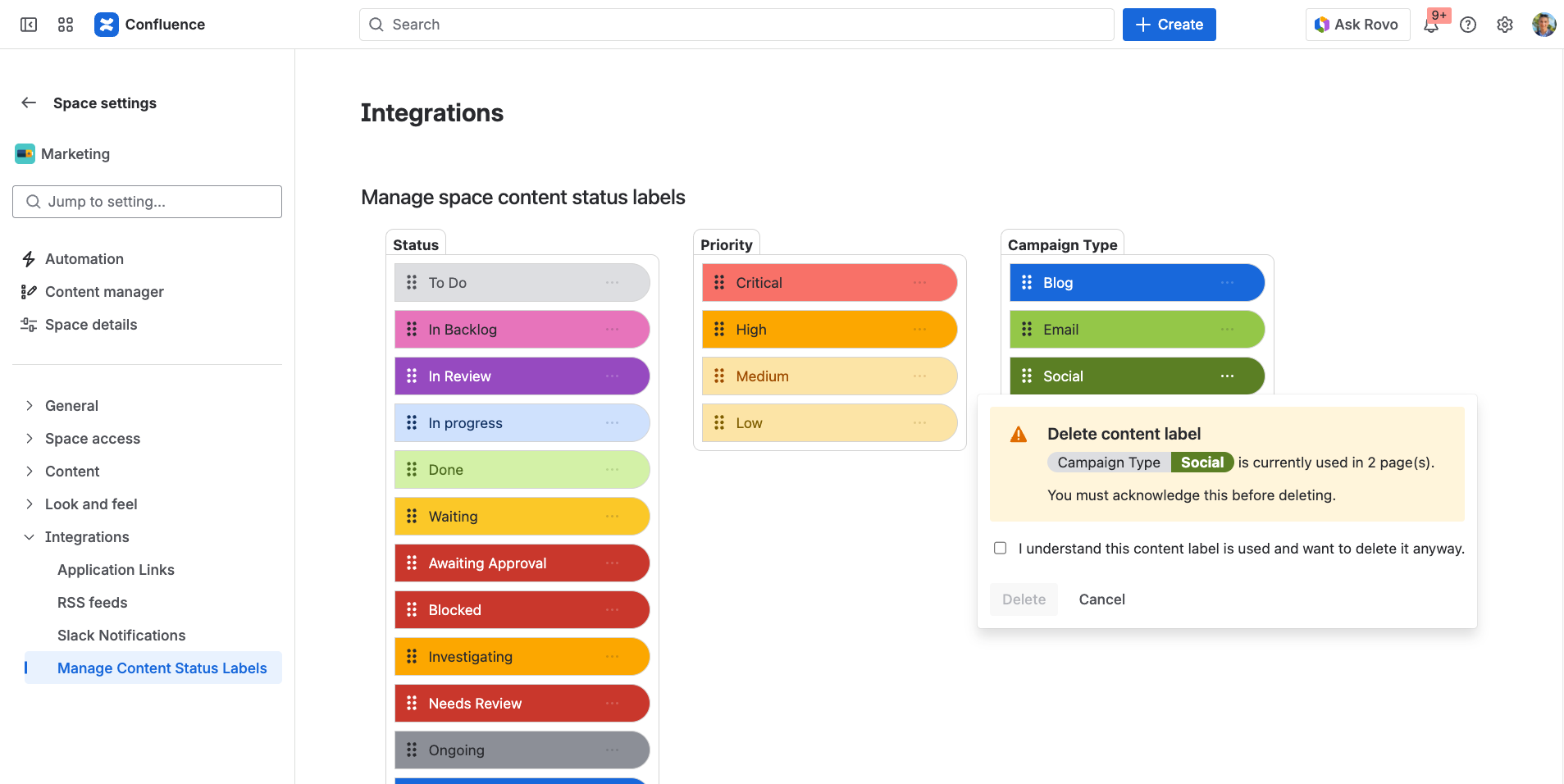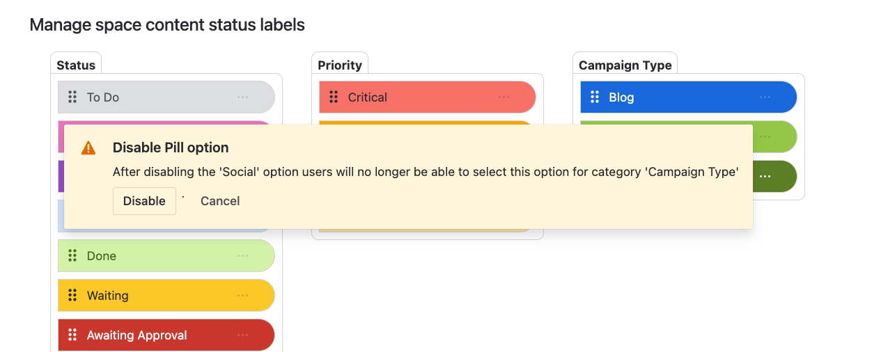 - Delete or Disable values – If you attempt to delete a value that is currently present on one or more pages, a warning and confirmation pop-up will appear, as seen below.