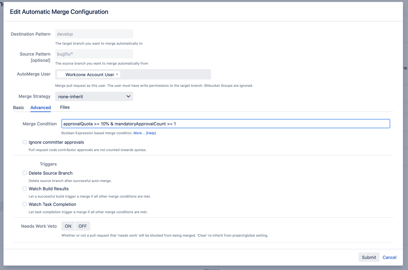 Workzone’s Advanced Merge Conditions allow enterprises to define nuanced and enforceable merge policies using a powerful boolean logic engine—far beyond the capabilities of native Bitbucket Server/Data Center merge checks.