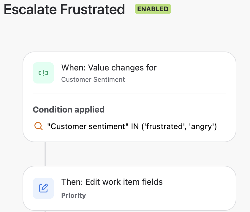 - Elevated in priority through simple automation rules — for example, automatically increasing the issue priority to “High” if a frustrated sentiment is detected.