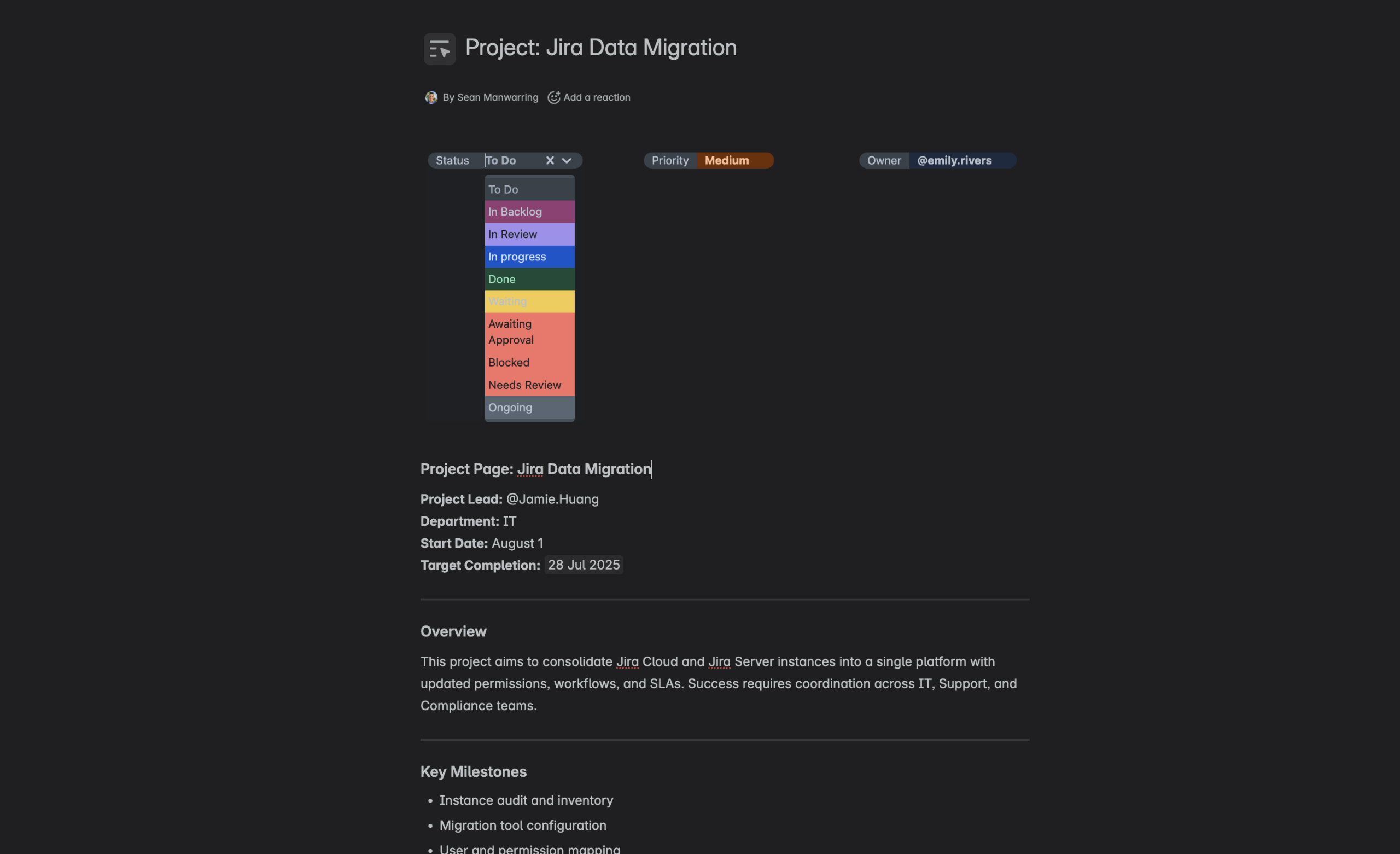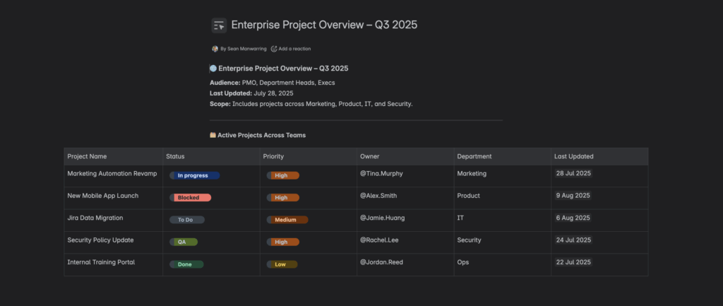 - Supports global search and filtering—turning Confluence into a real-time status dashboard for enterprise knowledge.