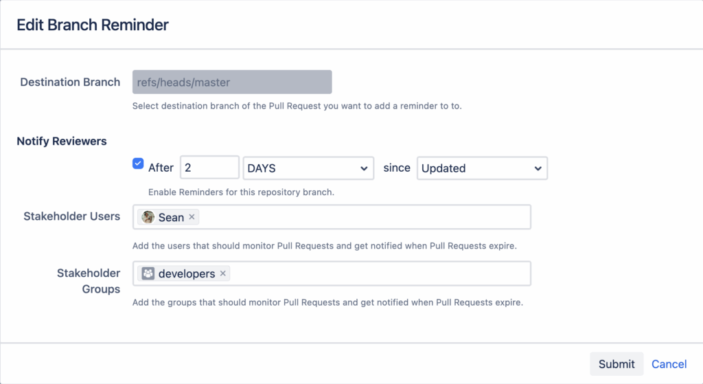 Reminders for Bitbucket automatically nudges reviewers who haven’t completed their reviews within the configured timeframe. By sending timely email reminders directly to the reviewers—and notifying team leads or managers if needed—it keeps the review process moving smoothly. Configurable branch-specific reminder settings enable organizations to prioritize urgent branches like ‘release’ or ‘master’ for even faster feedback. This continuous visibility into overdue reviews helps teams maintain momentum and meet aggressive delivery timelines.